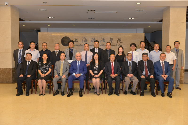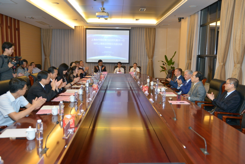 9月17日下午,上海合作组织秘书长阿里莫夫、前副秘书长王开文一行莅临上海政法学院考察中国-上海合作组织国际司法交流合作培训基地。上海政法学院党委书记夏小和、校长刘晓红、副校长关保英、副校长胡继灵、副校长姚建龙热烈欢迎秘书长的到来,并陪同参观校园、座谈交流。