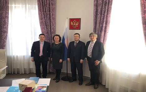 1月17日上午,代表团回访俄罗斯联邦总统直属国民经济与公共管理学院,双方举行了副校长级会见。讨论合作事宜。莫斯科商业研究所所长Sergey Myasoedov教授副校长级),总统学院法律和国家安全研究所所长(TBC) Stanyslav Mogilevsky先生(副校长级),总统学院商学院国际关系学院院长伊琳娜•蒂莫尼纳女士,总统学院商学院国际关系学院项目主任安德烈•科舒诺夫先生,参加了会见。本次会晤讨论了双方联合办学项目的制定和实施、 学生与学术交流、.在2020年盖达尔论坛上,共同举办“一带一路”发展专题论坛等重要合作项目。