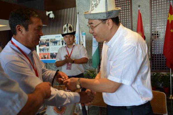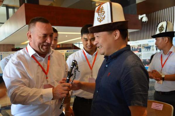 潘牧天和方雷代表中方与吉尔吉斯斯坦学员互赠礼物。(潘汇丰撰稿 徐卓然摄影)