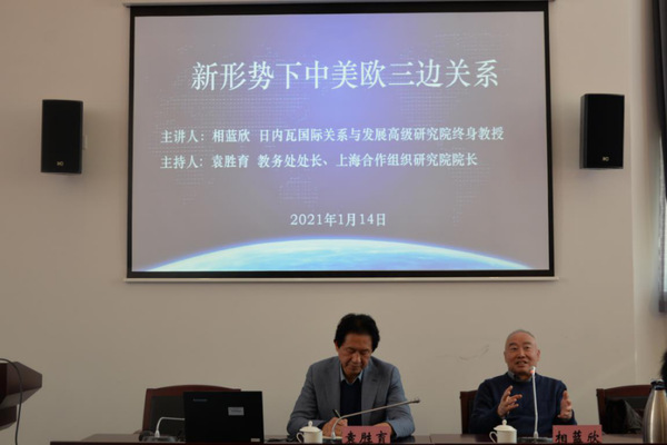 1月14日下午,问道讲坛迎来了日内瓦国际关系与发展高级研究院终身教授相蓝欣,为中国-上合基地作“新形势下中美欧三边关系”讲座。教务处处长、上海合作组织研究院院长袁胜育教授主持讲座。