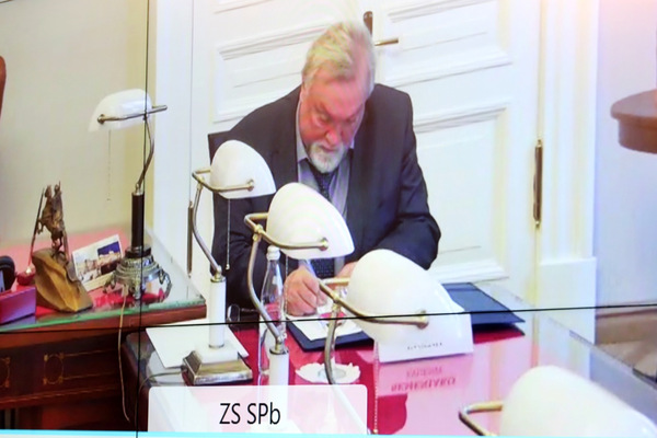 会上,陈靖和索洛维约夫“云”交换了《上海市人民代表大会常务委员会与圣彼得堡立法大会增进友好交流与合作协议书(草案)》,共同见证并祝贺中国-上海合作组织法律服务委员会交流合作基地(上海政法学院)与圣彼得堡律师协会“云”签署合作备忘录。市人大外事委主任委员高德毅表示,随着两市之间商事合作逐渐增多,此次签署的合作备忘录将在上海和圣彼得堡的法律工作者之间搭起重要的桥梁,为双方提供更多法律服务与合作。