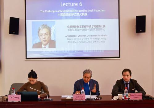 为帮助青年学子拓宽跨区域多边合作视野、深化对全球治理与多边主义的认知,12月9日,中国—上海合作组织国际司法交流合作培训基地(以下简称“中国—上合司法培训基地”)在综合楼107会议室举办“国际组织工作坊”第六讲。本次活动以“小国面临的多边主义挑战”为主题,特邀哥斯达黎加外交部外交政策副总司长克里斯蒂安·吉耶梅特·费尔南德斯(Christian Guillermet Fernández)大使,联合国和平大学驻日内瓦办事处大使兼常驻观察员、我校“尚合学者”大卫·费尔南德斯·普亚纳(David Fernandez Puyana)莅临分享。讲座由中国—上合司法培训基地办公室教师曹雨奇主持。中国—上合司法培训基地办公室教师代表、“尚合实习生”“尚合研学生”及我校部分学生参加。